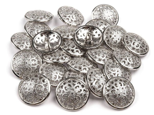 Filigránový vzor dodáva gombíkom umelecký nádych. Sú vyrobené zo zliatiny zinku a nemagnetických kovov. Majú spodné prišívanie. Gombíky podčiarknu dokonalosť kabátov, sák a pod. Vyniknú tiež na doplnkoch ako sú kabelky, tašky alebo klobúky. [Gombíky sú balené vo vrecku .]Veľkosť gombíkov nájdete v tejto tabuľke. [Zinok chráni kov proti korózii. Pozinkované výrobky po vypraní zostávajú bezo zmien.]