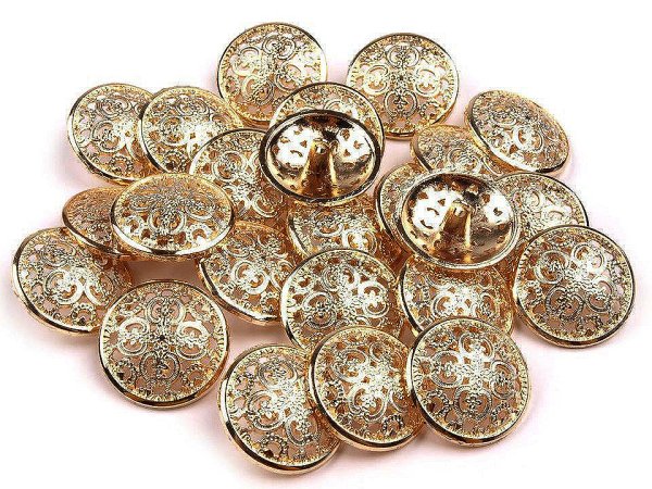 Filigránový vzor dodáva gombíkom umelecký nádych. Sú vyrobené zo zliatiny zinku a nemagnetických kovov. Majú spodné prišívanie. Gombíky podčiarknu dokonalosť kabátov, sák a pod. Vyniknú tiež na doplnkoch ako sú kabelky, tašky alebo klobúky. [Gombíky sú balené vo vrecku .]Veľkosť gombíkov nájdete v tejto tabuľke. [Zinok chráni kov proti korózii. Pozinkované výrobky po vypraní zostávajú bezo zmien.]