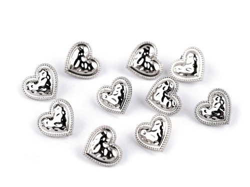Kovové gombíky v tvare srdca sú zaujímavé tepaným povrchom. Vyniknú na sakách, košeliach, šatách a pod. Môžete ich použiť aj na dekoráciu anjelik a iných postavičiek. Majú spodné prišívanie. Veľkosť gombíkov nájdete v tejto tabuľke.