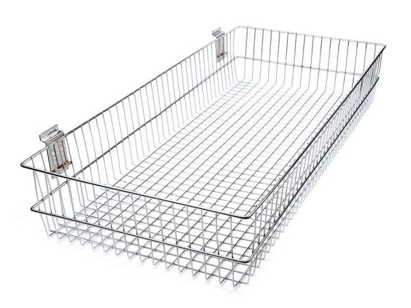 [Kovový kôš využijete v predajniach, kde vám pomôže prakticky a prehľadne vystaviť váš tovar (pozri inspiračné foto). Rozmery koša sú 40x90 cm, je vhodný na zavesenie na panely s drážkou.]