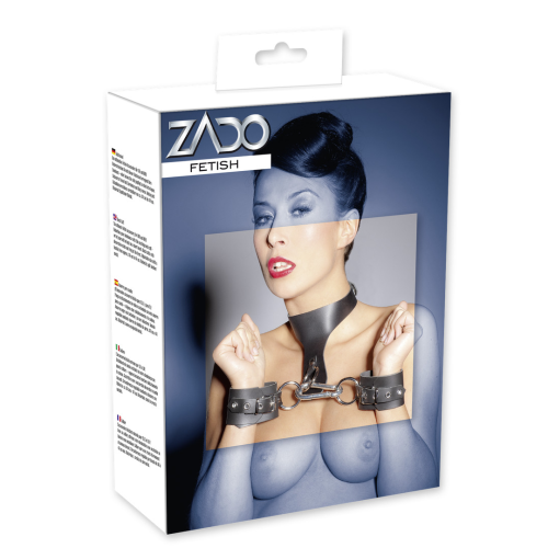 Kožený obojok s putami spojené karabínou s dĺžkou 8 cm. Priemer obojku: 37 až 45 cm Priemer pút: 23 až 31 cm