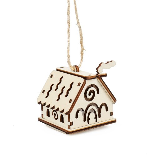Pekný malý 3D drevený domček s rozmermi 5x5x5 cm upúta vašu pozornosť dymiacim komínom na boku strechy. Domček má vďaka svojim vyrezaným vlnkám a vrtuľkám dievčenský charakter pripomínajúci cukrovú vežičku pre bábiku. Aj okná a dvere majú typický oblý charakter hradu či veže, ktorý poznáme z rozprávok o princeznách. Domček slúži ako drevená dekorácia na zavesenie alebo na položenie na poličku či stôl. Dodáva sa už postavený, tak ako ho vidíte na obrázku. Súčasťou je aj LED sviečka, v ktorej je vymeniteľná 3V batéria. Hlavné vlastnosti: dekorácia aj na zavesenie s motívmi vlniek a vrtuľiek s LED sviečkou vo vnútri vyrobené z 3 mm topoľového dreva