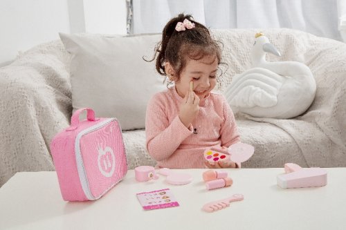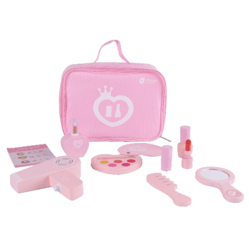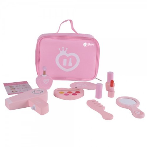 S touto drevenou make-up sadou máte vždy všetko po ruke, aby ste boli krásna. Veci ľahko prenesiete vo veselej ružovej taštičke. Kozmetická taštička s doplnkami na líčenie je ideálnou hračkou pre malú princeznú. Táto sada pomáha podporovať rozvoj detskej predstavivosti a taktiež rozvíja jemnú motoriku. Rozmer balenia: 21 x 7,5 x 16 cm Vhodné pre deti od 3 rokov