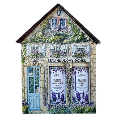 Kozmetická sada Levanduľový domček obsahuje sprchový gél 100 ml a sprchový gél 2v1 s bylinnými extraktmi a vôňou levandule. Obal má tvar domčeka s ručne kreslenou grafikou.