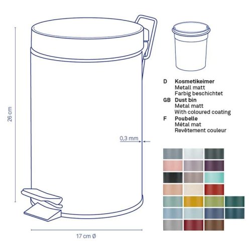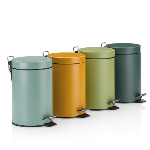 Pre menší odpad v kuchyni alebo kúpeľni: kovový pedálový kôš s matným povrchom v kari žltej. Guma na spodnej strane zaisťuje pevný stoj. Vnútorné vedro je vyrobené z čierneho plastu a má praktické ucho na prenášanie. Odpadkový kôš je vysoký 26 cm a má priemer 17 cm. objem 3l. Kov s práškovým nástrekom matný 3L, 17cm, 26cm v
