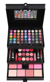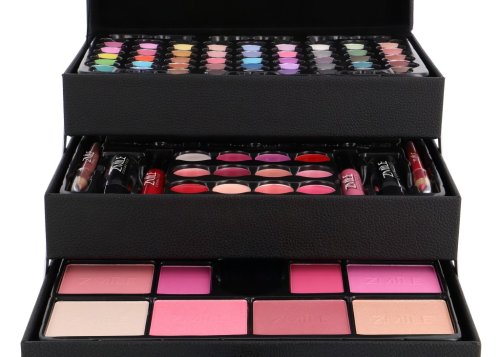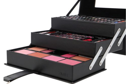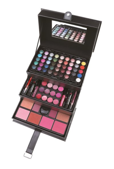 Kozmetický kufrík kožený Beauty Case Black - kožený čierny - celkom 82 ks príslušenstva. Obsahuje 45× očnými tieňmi, 12× krémový lesk na pery, 8× tvárenka, 2× lesk na pery, 2× rúž, 2× ceruzka na pery, 1× sada 10 ks štetcov a aplikátorov, 1× integrované zrkadlo. vyhovuje prísnym normám EÚ.