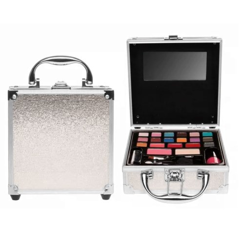 Hliníkový mini kozmetický kufrík so strieborným povrchom. Obsah: 1 x zrkadlo, 14 x farby očných tieňov, 3 x trblietavé farby na pery, 1 x tvárenka, 1 x púder, 1 x rúž, 1 x lak na nechty, 1 x štetec na tvárenku, 1 x hubičkový aplikátor a 1 x štetec na pery.