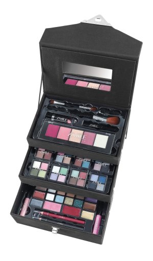 Kozmetický rozkladací kufrík ‚Beauty Case 'Velvety' tmavo šedý – limitovaná edícia – celkom 72 ks príslušenstva. Obsahuje 32 ks očných tieňov 3× tvárenka, 2xočná linka, 3x farba na obočie, 1xvosk na obočie, 8× krémové očné tiene, 4x trblietavý krém na telo, 2xkrémový rúž, 1x r × ceruzka na pery, 1xštetec, 5× obojstranný aplikátor a integrované zrkadlo. Dermatologicky testované, vyhovuje prísnym normám EÚ.