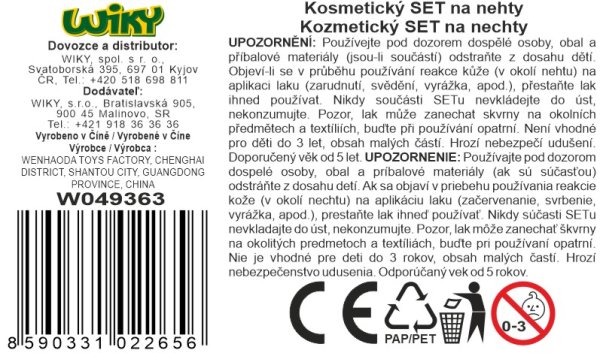 Kozmetický set starostlivosti o nechty. Obsahuje nalepovacie nechty, lak na nechty, pilník, nálepky na nechty, lak na nechty.