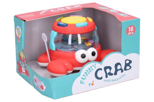 Krab bubienok s efektmi 11 cm. Veľkosť 13x11x7.5cm. Krab má voľné kolesá. tlačidlo on/off. Svetelné a zvukové efekty (melódie, bubienok, zvuky prírody, zvukové efekty). 2xAAA batérie súčasťou.