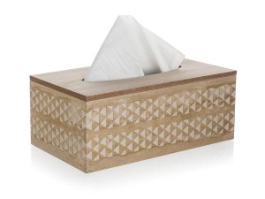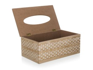 Krabička na papierové vreckovky je vybavená otváracím vekom s pántami na doplnenie. Krabička je vo farbe prírodného dreva, z 3 strán je zdobená bielym ornamentom.
