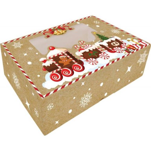 Krabička na vianočné pečivo či výslužku skladacia, s priehľadným okienkom - motív vianočný vláčik. Rozmery 36x22x5 cm.
