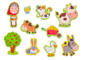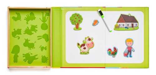 S touto kúzelnou magnetickou skladačkou si môžete vytvoriť svoju vlastnú farmu. Otvorte drevenú krabičku plnú magnetických zvieratiek, ľudí, domčekov a ďalších prvkov s motívom farmárčenia. Každý motív sa navyše musí poskladať z viacerých častí. Dieťa ich umiestňuje na magnetické veko s obrázkom statku a lúky. Inšpiruj sa priloženými kartičkami s predlohou. Z druhej strany magnetického veka sa nachádza plocha na maľovanie. Maľovať môžete priloženou mazacou fixkou, ktorá je zároveň vybavená hubkou. Maľujte znova a znova. Magnetické tvary je možné priložiť z oboch strán magnetického veka. Celá sada je uložená v drevenej krabičke, ktorá má zatváranie opatrené pevnou gumičkou. Môžete tak sadu so sebou vziať pohodlne aj na cesty. Hra rozvíja detskú kreativitu a jemnú motoriku. Obsah sady: 55 magnetických tvarov, 8 kartičiek s inšpiráciou a mazacia fixka s hubkou. Rozmery balenia: 20 x 27 x 4 cm. Vek: 3+