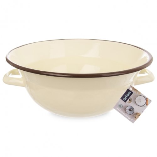 Zarábací smaltovaná misa s uchami. Farba smotanová, hnedý okraj. Priemer 26 a výška 11 cm, objem po skosenú hranu 2.5 litra. EAN 8592381069513