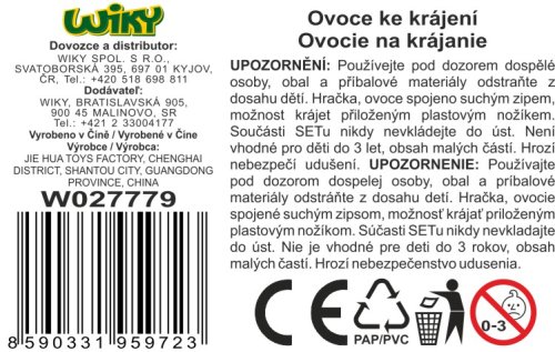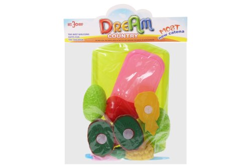 Krájacie ovocie set s táckou. Rozmery tácky 21x14x1 cm. Krájacie ovocie na suchý zips. Obsah balenia - krájacie ovocie, tácka, doštička, plastový nožík.