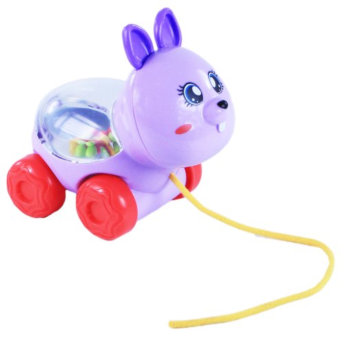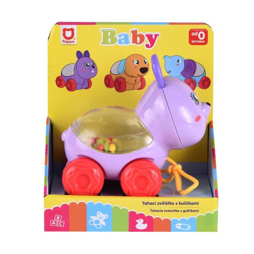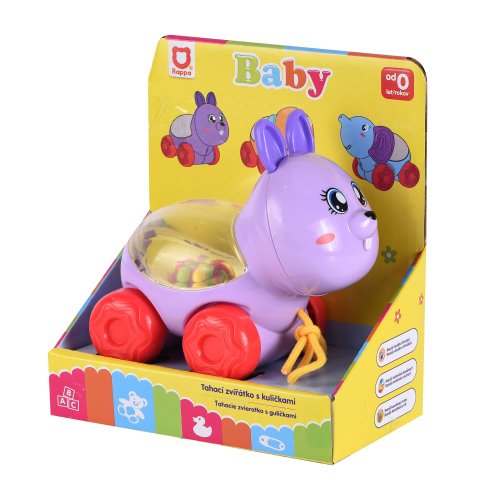 Veselé zvieratko králik na kolieskach s farebnými guličkami. Ťahaním či pohybom zvieratka začnú guličky vo vnútri poskakovať. Táto hračka zaujme a pobaví aj tie najmenšie deti.
