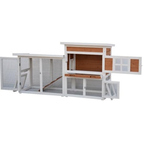 priestranný a dobre prístupný koterec aj výbeh, výsuvné kovové dno koterca pre ľahké čistenie, odnímateľné bočné panely umožňujú rozšírenie výbehu, okienko s priehľadnou plastovou výplňou, pultová strecha so zahnutým dolným presahom pre rýchly odtok vody,