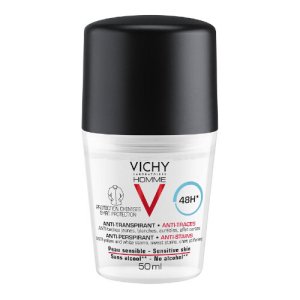 Dezodorant roll-on pre mužov proti škvrnám s 48 hodinovým účinkom Homme vznikol pre potreby citlivej pokožky, pretože neobsahuje alkohol.