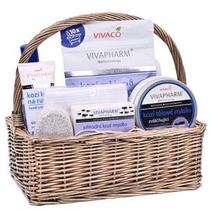 Krásne darčekové balenie kozmetiky s kozím mliekom na starostlivosť o pokožku tela i tváre v prútenom darčekovom koši.