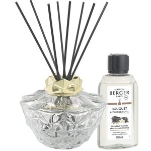 Sada obsahuje: Tyčinková aróma difuzér Kali transparentná 200 ml 8 kusov čiernych polymérových vonných tyčiniek Náplň do difuzéra Vanilla Magnificence (Bouquet Recharge/Refill) 200 ml
