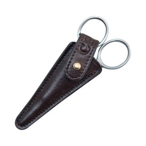 Zastrihávacie nožnice na fúzy sú zabalené v puzdre z prírodne farbenej kože a zaistené remienkom a mosadznou sponou.
