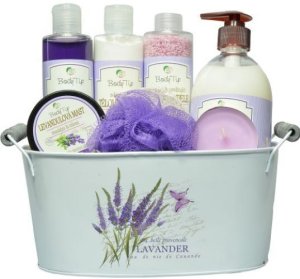 Darčekové balenie kozmetiky v dekoratívnom plechovom obale s levanduľovým olejom.