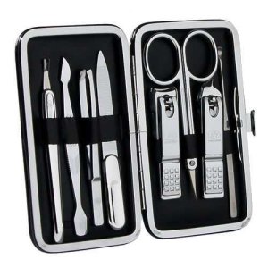Čierna minimalistická manikúrna sada obsahuje 6 základných nástrojov: dvoje klieštiky na nechty, pinzeta manikúrna skosená, nožnice na koži, pilník, zatlačovač kožičky.
