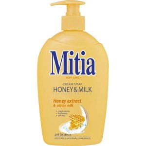 Tekuté mydlo Mitia s mliečnym a medovým extraktom, ktorý pokožku vyživuje a zvláčňuje Jemné krémové zloženie vyživuje a zvláčňuje pokožku.