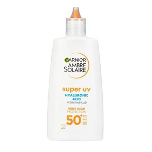 Opaľovací fluid na tvár s ľahkou textúrou as obsahom kyseliny hyalurónovej chráni pleť pred UV žiarením.