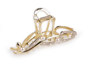 Kovový škripec do vlasov [je bohato zdobený] trblietavými brúsenými kamienkami, vďaka ktorým je neprehliadnuteľný.