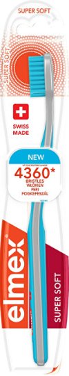 Zubná kefka elmex® Super Soft s vysokou hustotou až 4360 vlákien s priemerom 0,13 mm, ktorá čistí s jemnou starostlivosťou zuby aj ďasná.