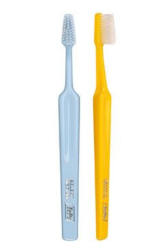 Stredne tvrdý zubná kefka sa zužujúci sa hlavičkou a zástrihom ukončeným aktívny špičkou.