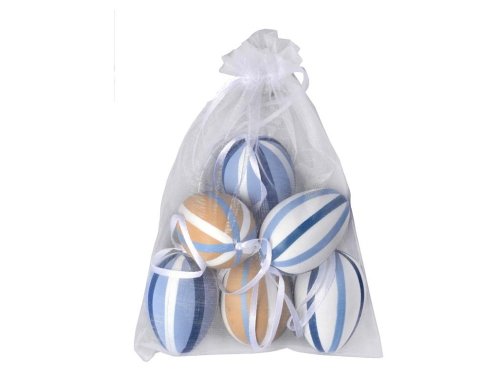 Elegantná sada 6 veľkonočných kraslíc o veľkosti 60 mm je zdobená jemným prúžkom, ktorý dodáva vajíčkam moderný a pritom tradičný vzhľad. Kraslice sú dodávané v krásnom organzovom sáčku, vďaka ktorému sú pripravené na okamžité zavesenie alebo darovanie. Farebný mix vytvára pestrý a veselý efekt, ideálny pre jarnú výzdobu interiéru, vetvičiek alebo veľkonočných aranžmánov. Štýlová a vkusná dekorácia, ktorá oživí každé veľkonočné sviatky. Tovar je dodávaný v mixe. Doručovaný tovar je vyberaný náhodne a nie je možné vybrať konkrétne prevedenie.