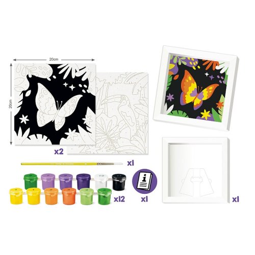 • 2 šablóny (20 x 20 cm), * 12 fľaštičiek s akrylovými farbami, * štetec, * rámček, Vhodné pre deti od 7 rokov.