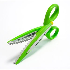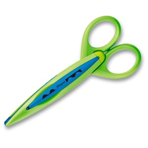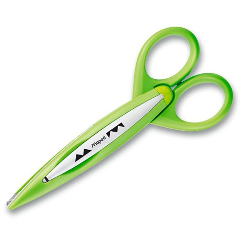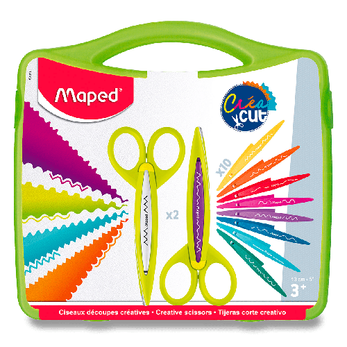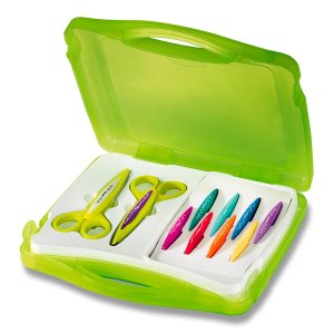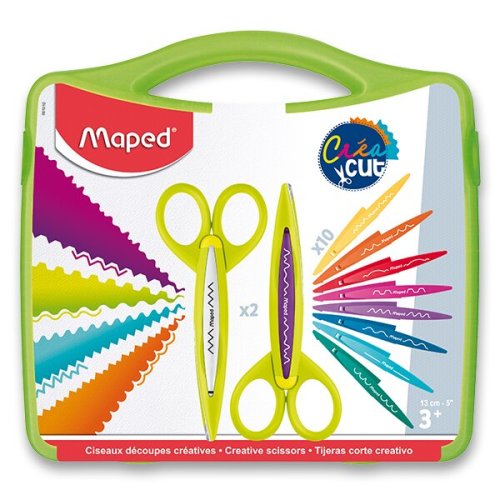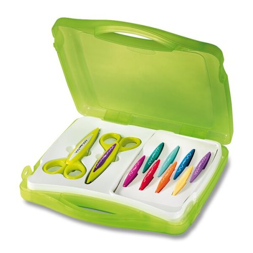 Kreatívne nožnice pre deti aj dospelých. Ľahko vymeniteľné dekoratívne čepele zo skleného vlákna. Nemôžu strihať látku, vlasy ani kožu. Strihajú papier 40 až 250 g. Kufrík obsahuje 2 ks nožníc a 10 ks čepelí s rôznymi vzormi.
