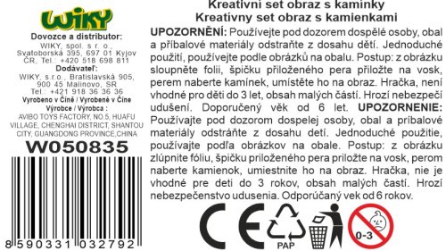 Kreatívne set obraz s kamienkami dino. Veľkosť 17,5x17,5x1,5cm. Obsahuje misku na kamienky, pero na naberanie a umiestňovanie kamienkov, kamienky rôznych farieb, vosk, rámček. Postup: z obrázku zlúpnite fóliu, špičku priloženého pera priložte na vosk, perom naberte kamienok, umiestnite ho na obraz.
