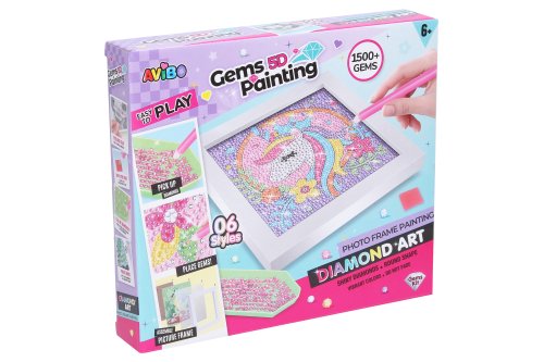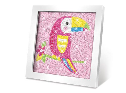Kreatívne set obraz s kamienkami papagáj. Veľkosť 17,5x17,5x1,5 cm. Obsha balenie - miska na kamienky, pero na naberanie a umiestňovanie kamienkov, kamienky rôznych farieb, vosk, rámček. Postup: z obrázku zlúpnite fóliu, špičku priloženého pera priložte na vosk, perom naberte kamienok, umiestnite ho na obraz.
