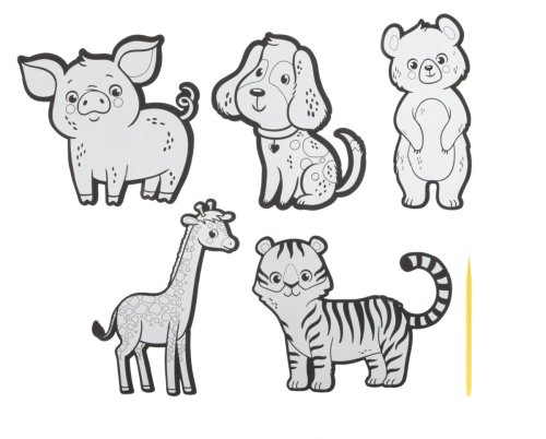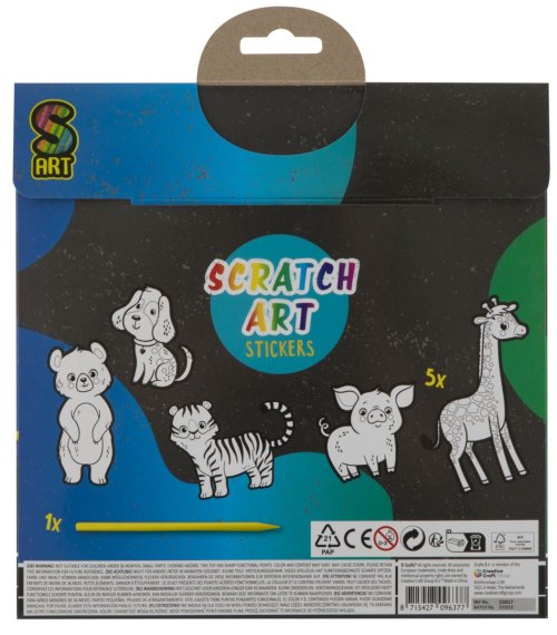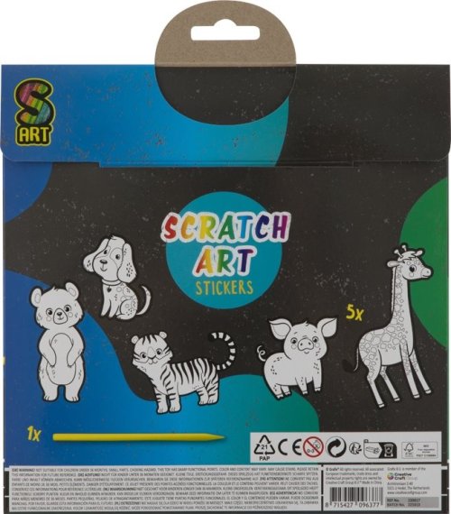 Papier potiahnutý vrstvou prekrýva podklad s dúhovým efektom. Priloženým škrabacím perom vyškriabte predtlačený obrázok. Farebný obrázok je možné si potom nalepiť. Veľkosť jednej samolepky: cca 15 cm.