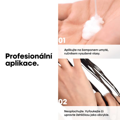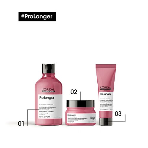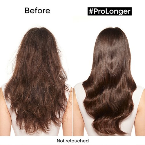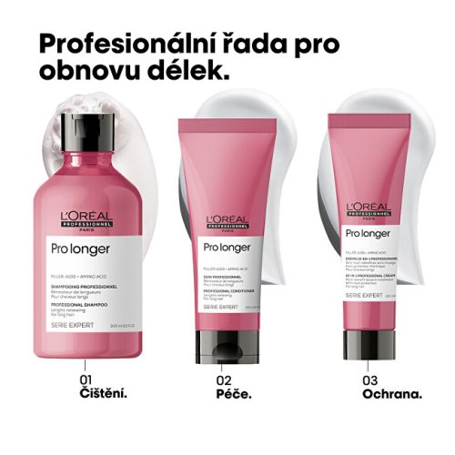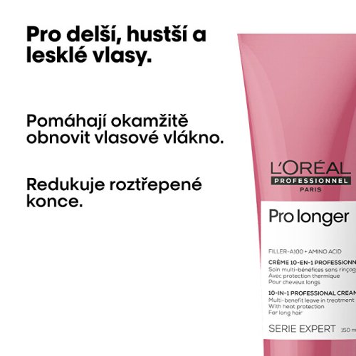 Multifunkčná bezoplachová starostlivosť Pro Longer pre dlhé vlasy pomáha zosilniť vaše dlhé vlasy a zároveň im dodáva viditeľne zdravší a silnejší vzhľad. Pri používaní v kombinácii s Pro Longer šampónom pre dlhé vlasy prináša o 47% menšie lámanie vlasov a 41%* viditeľnú redukciu rozstrapkaných končekov. Technológia Filler A-100 je patentovaná značkou L'Oréal Professionnel a funguje tak, že preniká do jadra vlasového vlákna, ktoré vypĺňa a zosilňuje vlasy zvnútra. Aminokyseliny v zložení zaisťujú zosilnenie vlasov zvonku. Zloženie pôsobí na stenčené končeky, alebo miesta, ktoré najviac potrebujú pomoc. inštrumentálny test, po aplikácii šampónu + bezoplachovej starostlivosti Exkluzívna kombinácia FILLER-A100 a aminokyselín pre obnovu dĺžok a vyplnenie končekov. S multifunkčnou bezoplachovou starostlivosťou Serie Expert Pro Longer: o 47 % menšie lámanie vlasov , o 41 % menej rozstrapkaných končekov* Inštrumentálny test Inštrumentálny test Pre Longer šampónu pre obnovu dĺžok + bezoplachovej starostlivosti