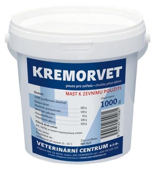 Krém napomáha pri hojení drobných poškodení kože a pri predchádzaní opuchov po bodnutí hmyzom, kde sa súčasne uplatňuje jeho protisvrbivý účinok. Prípravok je možné používať ako podporný prostriedok tiež pri zápaloch kože, pri ožiarení a popáleninách, na omrzliny, ako ochranu pred vznikom zaparenín a preležanín, pri ľahkých pomliaždeninách mäkkých tkanív. Vhodné pre psy a mačky. Určené iba pre zvieratá. Zloženie: 1 000 g prípravku obsahuje: Adeps lanae 200 g, Aluminii acetotartratis 100 g, Methylis salicylas 10 g, Aquapurificata 100 g, Vaselinum album 590 g. Dávkovanie a spôsob podávania: Veterinárny prípravok aplikujeme v tenkej vrstve na postihnuté denne. Upozornenie: Nepoužívať v prípade precitlivenosti na účinnú látku alebo na niektorú z pomocných látok. Prípravok je všeobecne veľmi dobre znášaný. V prípade precitlivenosti na niektorú zložku lieku môžu vzniknúť alergické reakcie. Špeciálne upozornenia: Účinná látka lieku sa neznáša s kožnými prípravkami obsahujúcimi tanín, soli striebra (najčastejšie argentum nitricum), acriflavinum chloratum, aethacridinum lacticum. Balenie: 1 kg