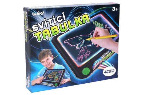 Kresliaca tabuľka svietiaca. 3xAAA batérie nie sú súčasťou. Veľkosť 25,5x23,5x3,5 cm. Návod na krabici. Obsahuje: mazacie fixky, handričku na mazanie, šablóny.
