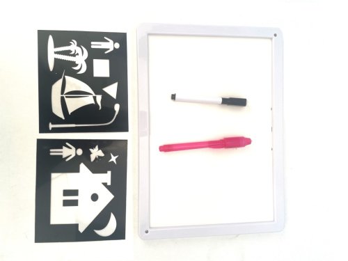 Súčasťou balenia sú dve ceruzky – jedna špeciálna svietiaca, druhá klasická, ktorá slúži ako bežné kresliace náčinie na druhú stranu tabuľky, ktorá je zároveň aj tabuľou na mazanie. Vďaka tomu má tabuľka dvojaké využitie – svietiace kreslenie a bežné kreslenie na bielu plochu. Okrem ceruziek sú k dispozícii aj šablóny s rôznymi tvarmi, ako sú dom, loď, raketa, postavičky či mesačné motívy, ktoré uľahčujú tvorbu obrázkov a rozvíjajú detskú predstavivosť.