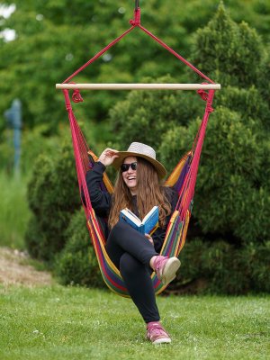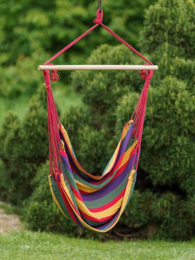 Závesné hojdacie kreslo je vhodné na terasy, do záhrad, ale aj interiéru. Kreslo má pevnú konštrukciu, jednobodové zavesenie a pestrofarebné prevedenie. Rozmery kresla: 100 x 100 cm, maximálna nosnosť 85 kg.
