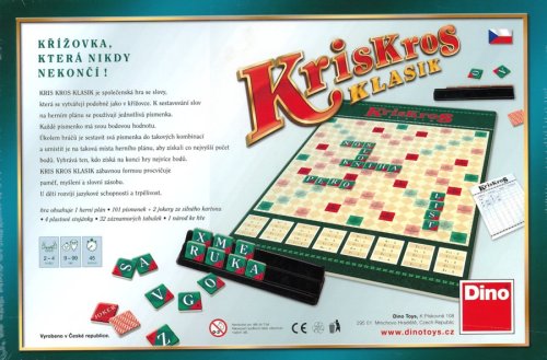 Hra Kris Kros klasik. Balenie obsahuje 1 herný plán, 101 žetónov s písmenkami, 4 plastové stojančeky, 32 záznamových tabuliek, 1 textilné vrecko a 1 pravidlá. Hra je určená pre 2 – 4 hráčov. Vhodné od 9 rokov.