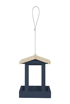 Závesné krmítko na semená (650g) z certifikovaného borovicového dreva a kovovým lankom pre väčšiu odolnosť. Vrchné plnenie cez otvárateľnú striešku.