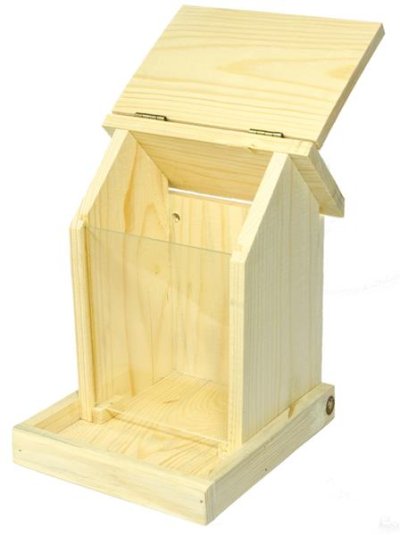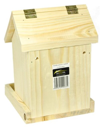 Drevené vonkajšie krmítko so zásobníkom pre voľne žijúce vtáky. Rozmery: Šírka 17 cm x hĺbka 18,5 cm x výška 24 cm. Materiál: Prírodné neošetrené mäkké drevo, plexisklo