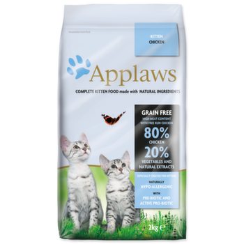 Applaws Kitten Chicken je kompletné krmivo pre mačiatka, vhodné aj pre gravidné a dojčiace mačky. Neobsahuje obilniny, je prirodzene hypoalergénny. Prírodne konzervované s vitamínom E a rozmarínovým olejom. Applaws obsahuje prírodné výťažky z brusníc, známe svojim prínosom pre zdravie močových ciest a prebiotiká pomáhajúce udržiavať zdravý tráviaci systém. Prírodné omega 3 a omega 6 mastné kyseliny vyživujú srsť a tým pomáhajú vytvárať hodvábny lesk a zároveň zachovať zdravú kožu. Antioxidačná formula obsahuje zmes prirodzene sa vyskytujúcich antioxidantov selénu a prírodných tokoferolov. Výhody prírodných antioxidantov sú čoraz viac uznávané, ako dôležité pre zdravie a vitalitu mačky. Zloženie: Kuracie mäso 62% (sušené), čerstvé kuracie mäso 17% (mleté - zdroj Omega 6), zemiaky, pivovarské kvasnice, repná dužina, kurací vývar 1%, lososový olej (zdroj omega-3, EPA a DHA), vitamíny a minerály, celé vajcia (sušené), rastlinná vláknina 0,03 %, chlorid soný, uhličitan vápenatý, morské riasy/kelp, brusnice, DL- Methionine (kyselina maslová - chráni pečeň a prirodzene zvyšuje kyslosť moču), chlorid juky, extrakt z citrusu, extrakt z rozmarínu. Analytické zložky: Hrubý proteín 38 %, hrubé oleje a tuky 20 %, hrubá vláknina 2,1 %, popoloviny 10,8 %, Omega 6 – 3,8 %, Omega 3 – 0,8 %, vápnik 2,7 %, fosfor 1,7%, Taurín 2000 mg/kg. Dávkovanie:
