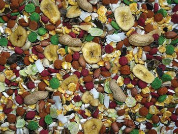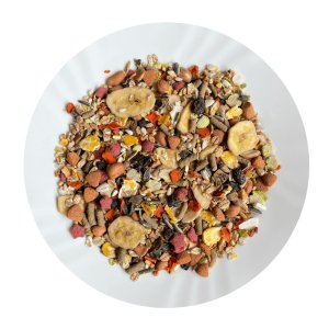 Zloženie: Pšeničné vločky, ovocie (banány, jablká, hrozienka, jarabiny), hrachové vločky, kukuričné vločky, extrudovaná kukuričná múka, svätojánsky chlieb, extrudovaná pšeničná múka, svetlice farbiarska, jačmenné vločky, arašidy lúp lucerna, kokos.