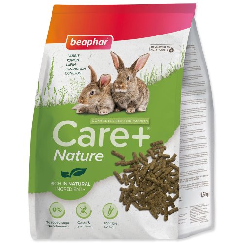 Beaphar Care+® Nature je kompletné bezobilninové krmivo pre králiky s vysokým obsahom vlákniny a bohatým na prírodné zložky. Špeciálne tvrdené pelety zodpovedajú prirodzenej strave králika a podporujú prirodzené opotrebovanie zubov.