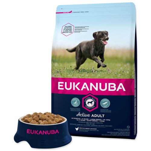Nová EUKANUBA vylepšená receptúra so zameraním na konkrétnu fázu života - pre veľkých aktívnych dospelých psov od 18 mesiacov do 6 rokov - poskytuje na mieru upravenú výživu pre podporu štíhlych svalov a vyvážený príjem energie, ktoré zaistia optimálny telesný stav vášho dospelého psa. Naša jedinečná na mieru upravená receptúra pre veľké dospelé psy obsahuje zmes vlákniny, prebiotiká FOS a repnej dužiny pre podporu zdravého zažívania, vápnik a glukosamín pre zdravé kosti a kĺby, prirodzený zdroj mastných kyselín omega-6 a omega-3 pre zdravú kožu a srsť, L-karni pre podporu imunitného systému. Naše unikátne granule v tvare šesťuholníka s prídavkom DentaDefense taktiež pomáhajú s udržiavaním čistých a zdravých zubov. Pokročilá výživa pre veľké dospelé psy so zameraním na podporu optimálneho telesného stavu a celoživotnú pohodu.